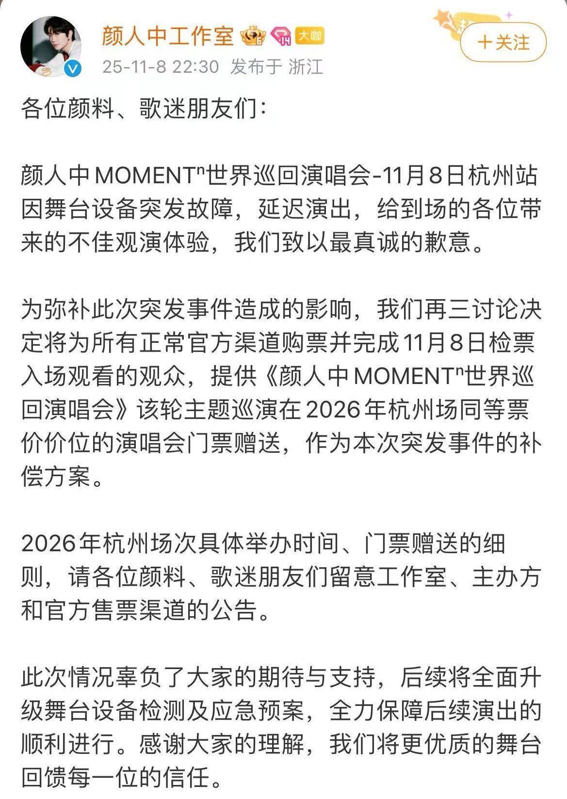 当晚10时30分,颜人中工作室发布官方致歉声明,进一步明确补偿细节:将为所有通过官方渠道购票并完成11月8日场次检票入场的观众,赠送2026年“MOMENTⁿ世界巡回演唱会”杭州场同等票价门票。具体演出时间及赠票细则将另行公布。